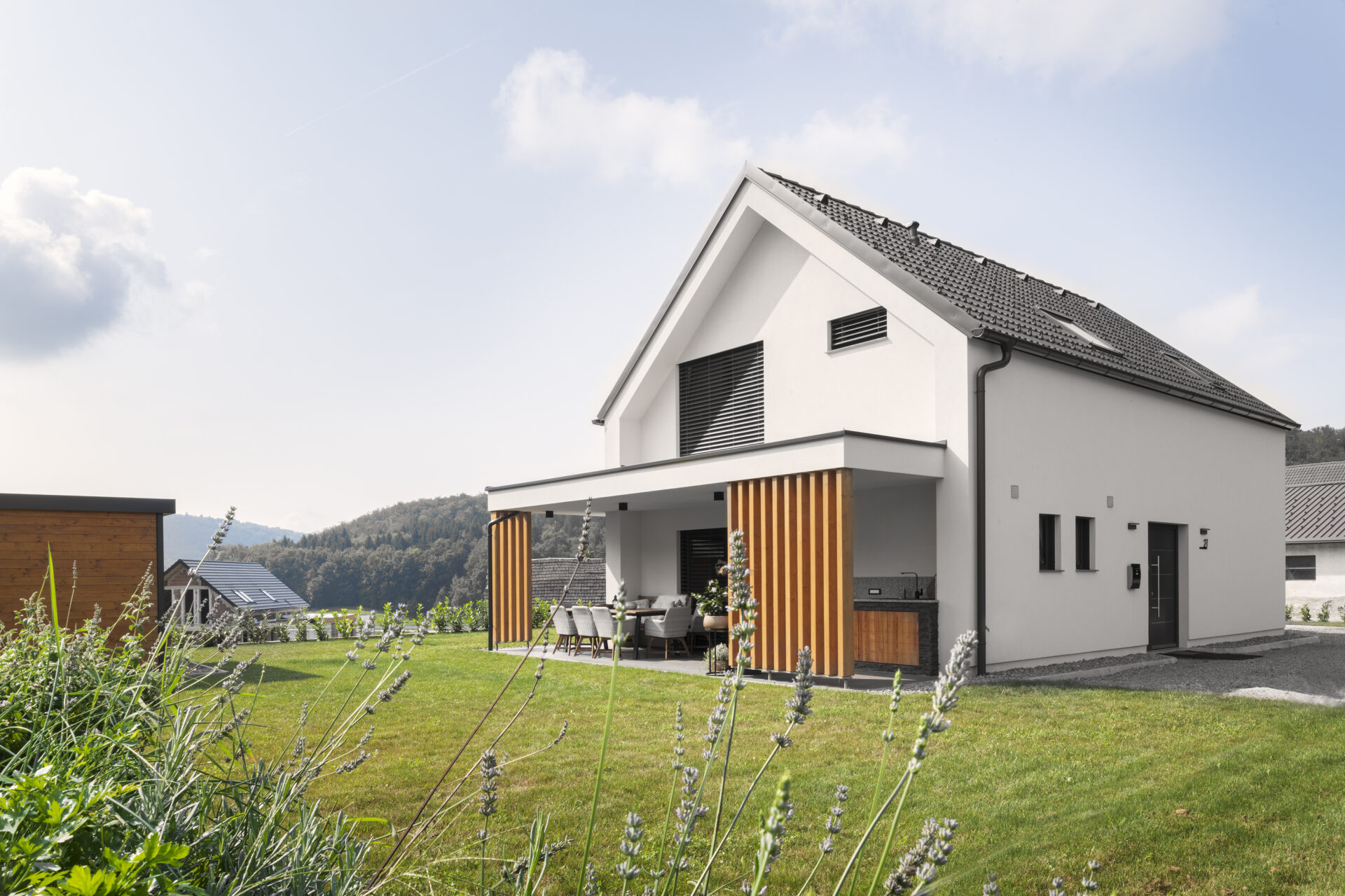 Wood was the element dictating the design of this house and its layout, which is evident from there notable wooden elements in the columns, which provide privacy and enhance the home’s appearance, and wood hidden in the framework of the walls. Design highlights include large glass surfaces in the living areas and bedroom. The house features no eaves. Instead, it has an extended external frame that highlights its simple shape.