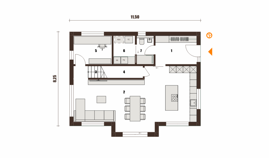 Sodobno zasnovana razporeditev prostorov v pritličju vključuje prostorno kuhinjo z jedilnico ter dnevno sobo, kjer skrbno zasnovan ambient ustvarja popoln prostor za skupne obede in nepozabne trenutke v krogu družine in prijateljev. Kuhinja je zasnovana z večjim kuhinjskim otokom, ki omogoča ustvarjanje kulinaričnih mojstrovin v domačem okolju. Centralna postavitev večje jedilne mize pa zagotavlja, da bo druženje v jedilnici srce družinskega in družabnega življenja v vašem domu. Dnevna soba s premišljeno postavitvijo pohištva ter naprav poskrbi za popolno udobje za vse družinske člane.