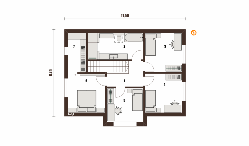 Mansardni del hiše je oblikovan kot miren kotiček z veliko zasebnosti. Tri otroške sobe ponujajo ravnovesje med udobjem, funkcionalnostjo in prostornostjo, saj je vsaka soba zasnovana kot prijeten prostor za spanje, učenje in ustvarjanje. Spalnica je oblikovana z ločeno garderobo, ki omogoča praktično in urejeno shranjevanje oblačil. Mansardna kopalnica je zasnovana z mislijo na funkcionalnost in komfort, saj poleg tuša vključuje tudi kopalno kad.