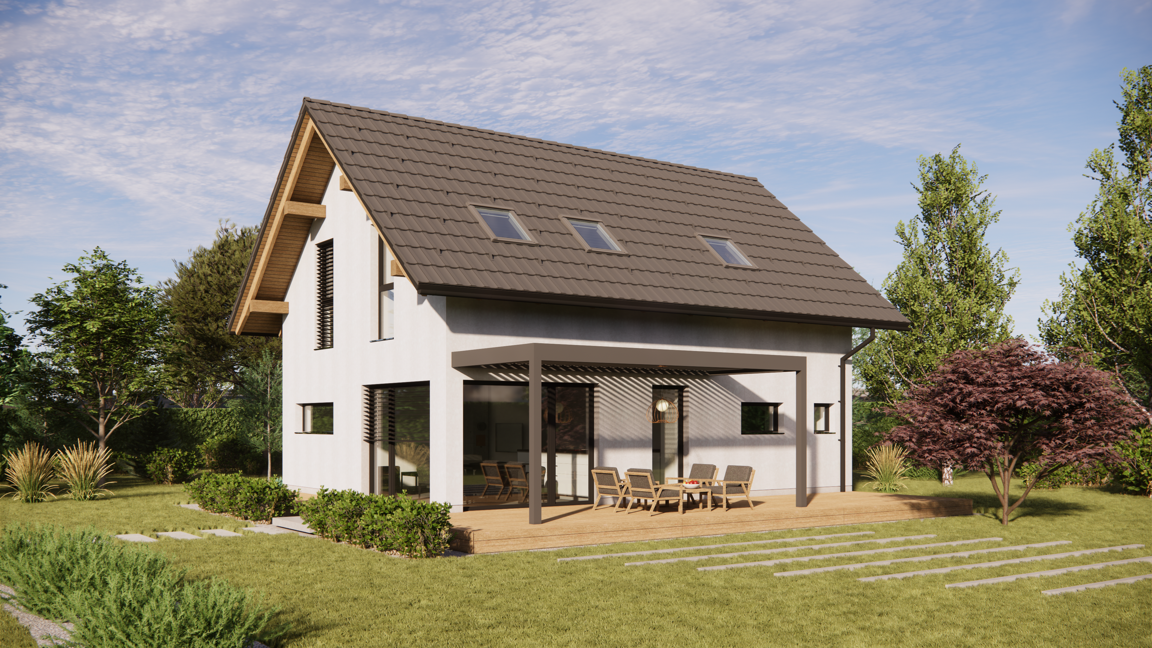 Lesena montažna hiša S 120 predstavlja kompaktno rešitev za vse, ki iščejo atribute prostornih hiš na samo 120 m2 bivalne površine. Z moderno zasnovo pritličja in optimalno razporejenimi prostori v mansardi, hiša ustvari ambient domačnosti, svetlosti in topline.