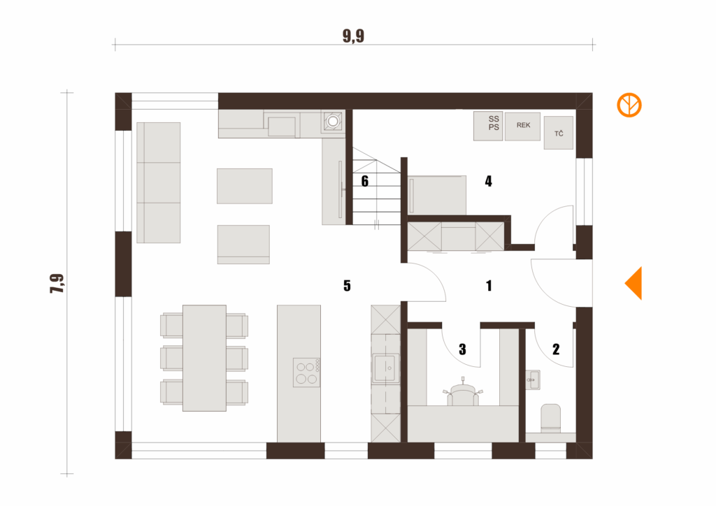 V pritličju je bivalni del z odlično izkoriščenostjo prostora organiziran kot odprt, svetel prostor. Kuhinja se preko jedilnice povezuje z dnevno sobo, ki ponuja popolno udobje za sprostitev in preživljanje skupnega časa ob gledanju filmov, branju ali druženju. Pritlični del poleg vhoda z garderobo ponuja še dnevni WC in tehnični prostor s pralnico ter možnostjo postavitve tuša za hišne ljubljenčke.