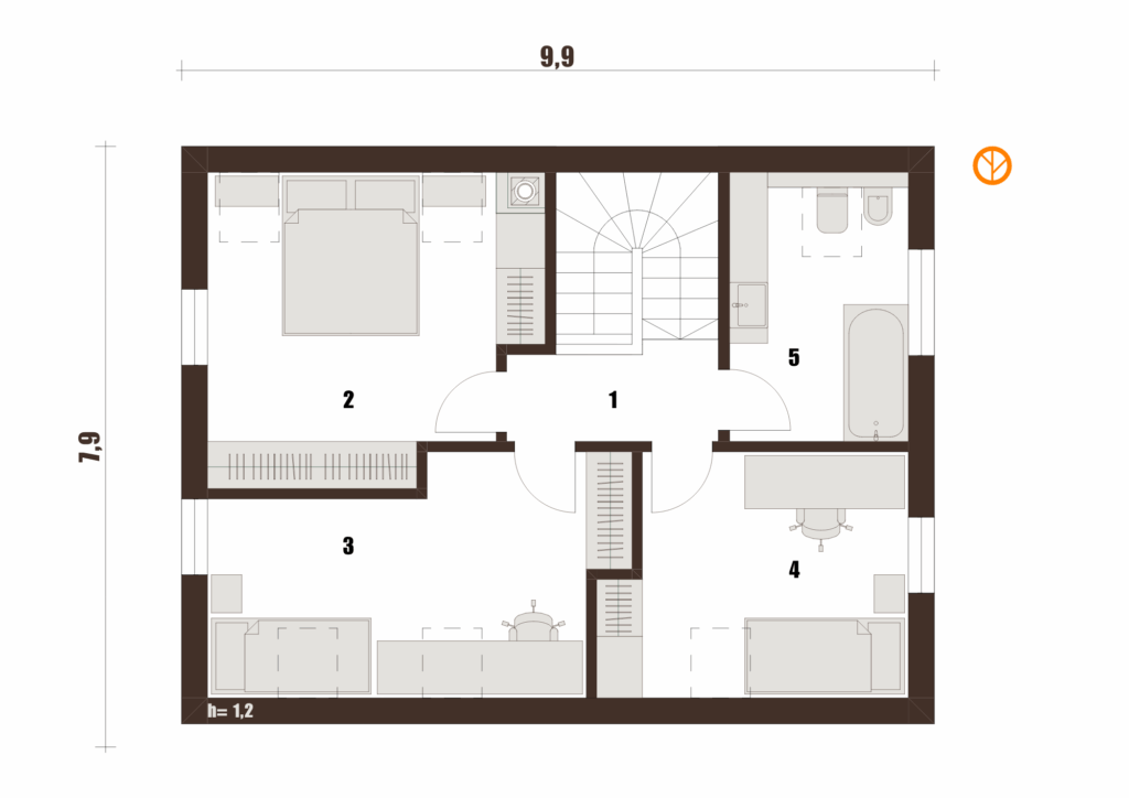 V mansardi so tri spalnice, katerih odlika so premišljeno umeščena strešna okna, ki sobe naredijo prijetno svetle in udobne. Tu najdete tudi večjo kopalnico, ki je na željo stranke zasnovana s postavitvijo kopalne kadi ali tuš kabine.