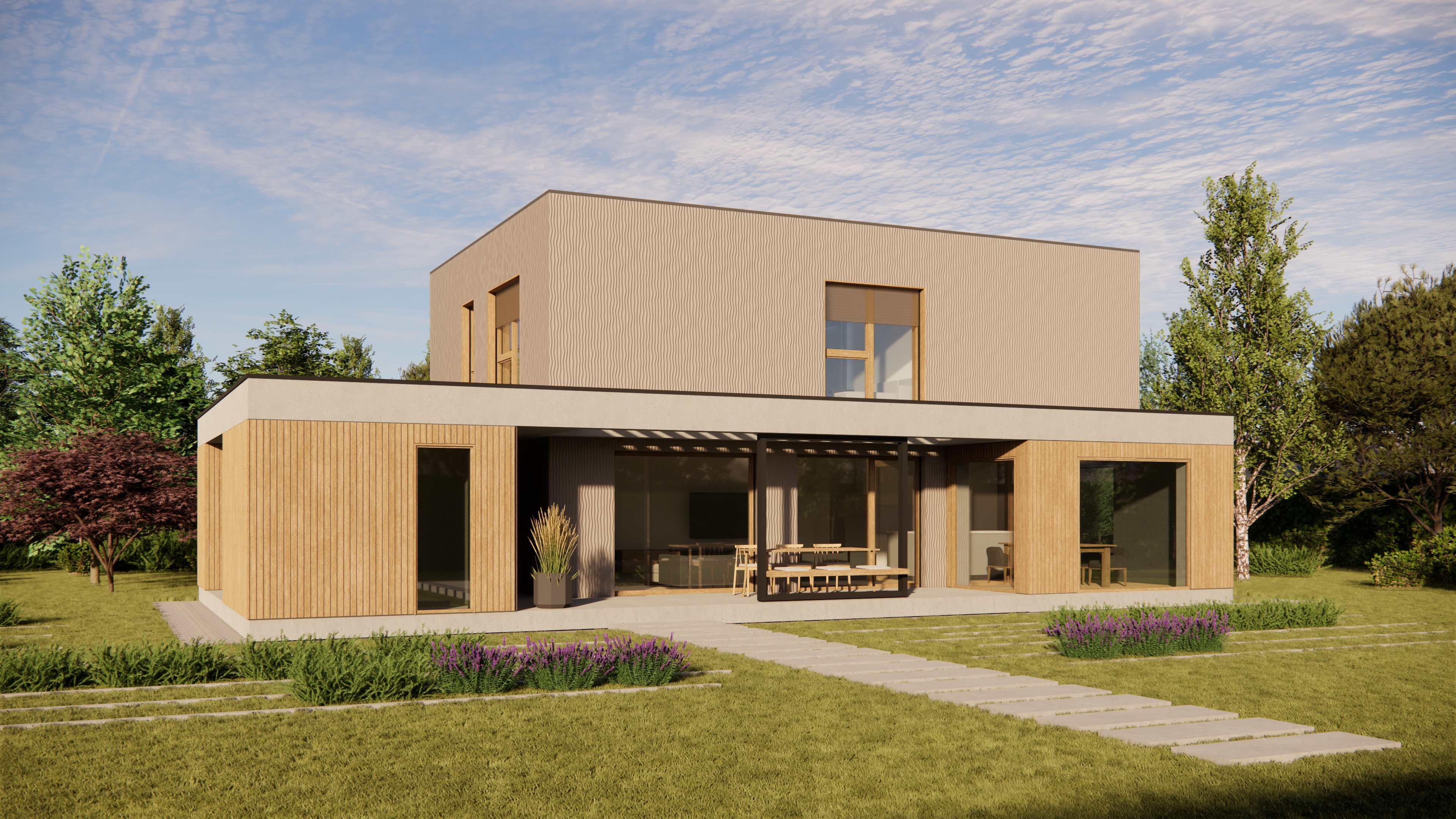 Dovršena zasnova ohranja bivalni del odprt in komforten, velike steklene površine pa poskrbijo za obilico naravne svetlobe, ustvarjajo vizualno povezavo z okolico ter podaljšajo hišo navzven. Na željo stranke lahko postavimo nadstrešnico za letno teraso, bio-klimatsko pergolo ali pokrito letno kuhinjo, s čimer bivalni prostor postane uporaben in prijeten v vseh letnih časih.