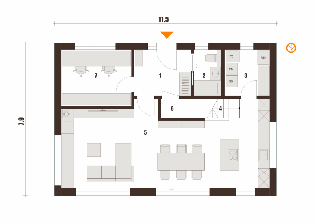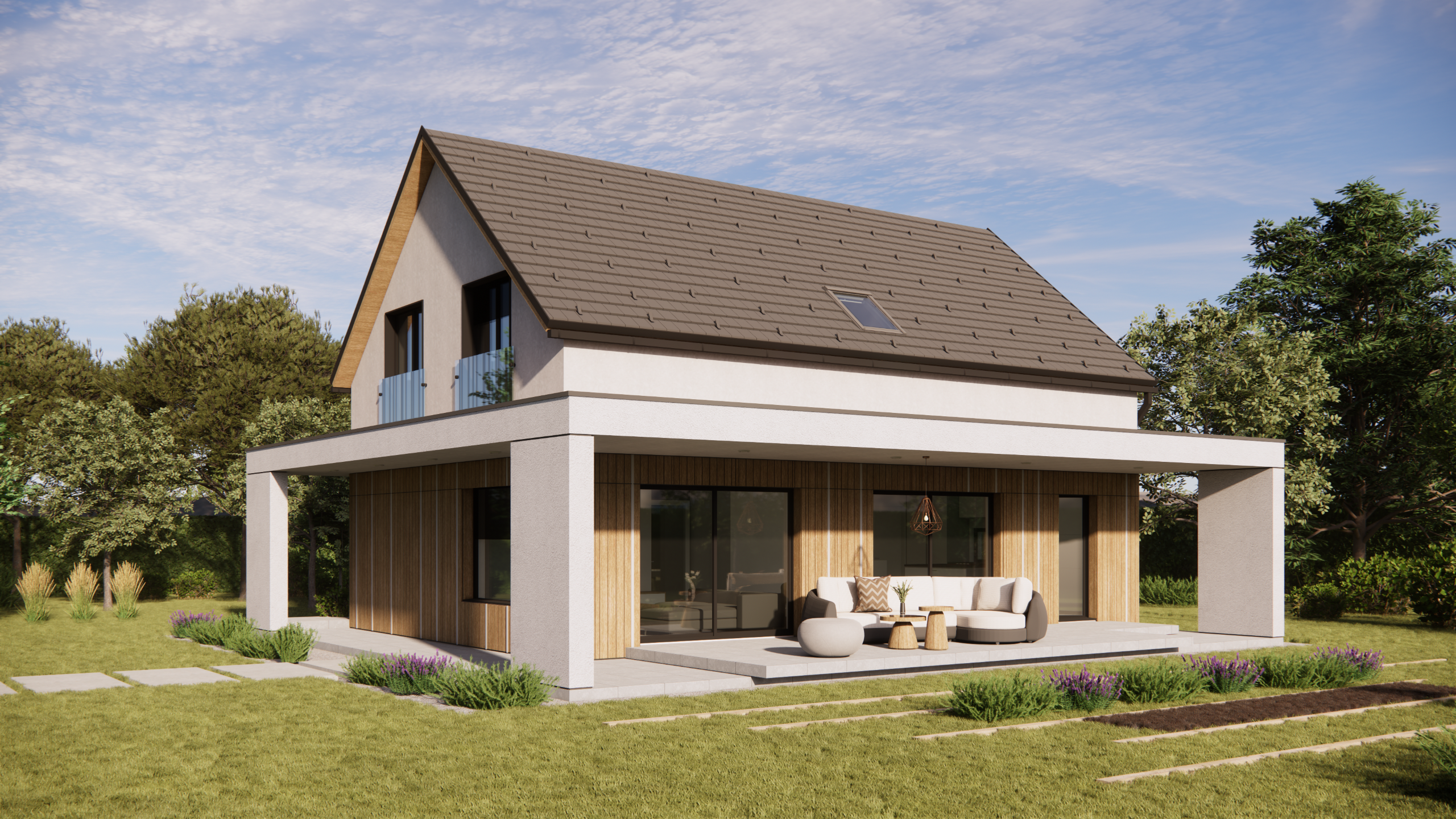 Centralno umeščen vhod v hišo vodi skozi predsobo z garderobnim delom v bivalni prostor, kjer se kuhinja, jedilnica in dnevna soba prepletajo v harmonično celoto. Velike steklene površine poskrbijo, da je prostor svetel in prijeten, hkrati pa omogočajo, da se bivalno okolje razširi navzven na teraso ali vrt, dodatno letno sobo pod bioklimatsko pergolo ali na željo stranke pokrito letno kuhinjo. V bivalnem delu je dovolj prostora za postavitev kamina, ki bo v zimskih dneh zagotavljal vabljivo toplino. Pritličje hiše ponuja še manjšo kopalnico s tušem, shrambo pod stopniščem ter tehnični prostor in pralnico.