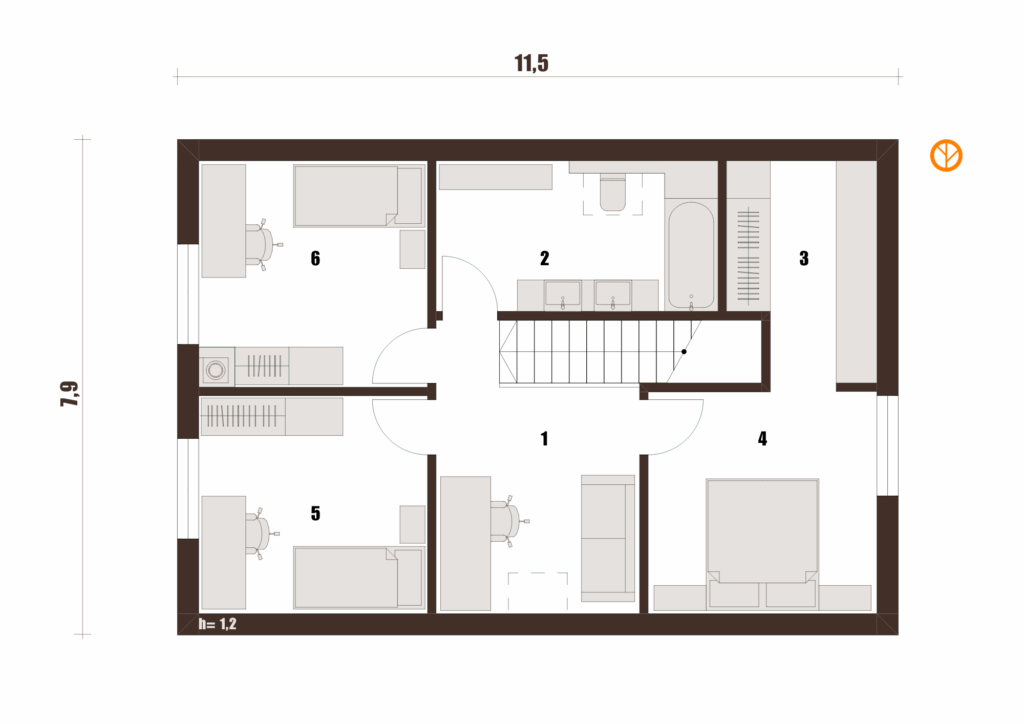 Mansardni del hiše vključuje dve prostorni otroški sobi, ki ponujata udoben prostor za igro, ustvarjalnost ali učenje. Spalnica je prostorna in svetla in je zasnovana z ločenim garderobnim prostorom. Mansardno kopalnico odlikujeta udobje in prostornost, kjer se lahko odločate za postavitev velike tuš kabine ali kopalne kadi. Na voljo je dovolj prostora za dva umivalnika in priročno komodo za shranjevanje brisač in kozmetike. Zasnova mansarde v osrednjem, skupnem prostoru omogoča številne možnosti, bodisi otroško igralnico, delovni kabinet ali dodatno garderobno sobo.
