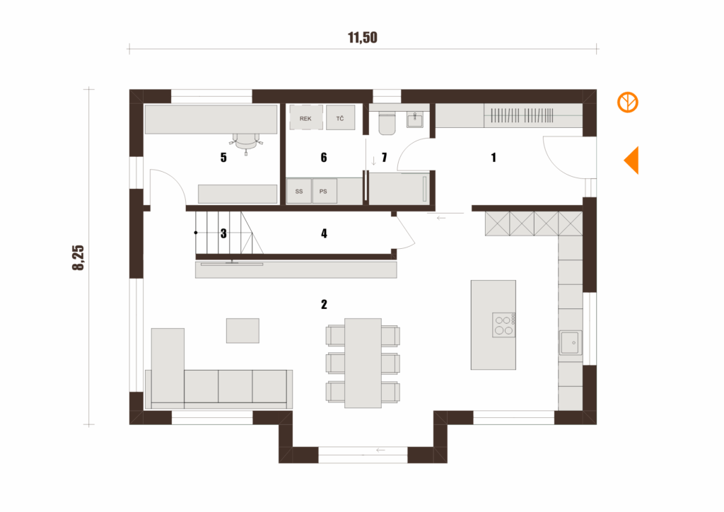Sodobno zasnovana razporeditev prostorov v pritličju vključuje prostorno kuhinjo z jedilnico ter dnevno sobo, kjer skrbno zasnovan ambient ustvarja popoln prostor za skupne obede in nepozabne trenutke v krogu družine in prijateljev. Kuhinja je zasnovana z večjim kuhinjskim otokom, ki omogoča ustvarjanje kulinaričnih mojstrovin v domačem okolju. Centralna postavitev večje jedilne mize pa zagotavlja, da bo druženje v jedilnici srce družinskega in družabnega življenja v vašem domu. Dnevna soba s premišljeno postavitvijo pohištva ter naprav poskrbi za popolno udobje za vse družinske člane.