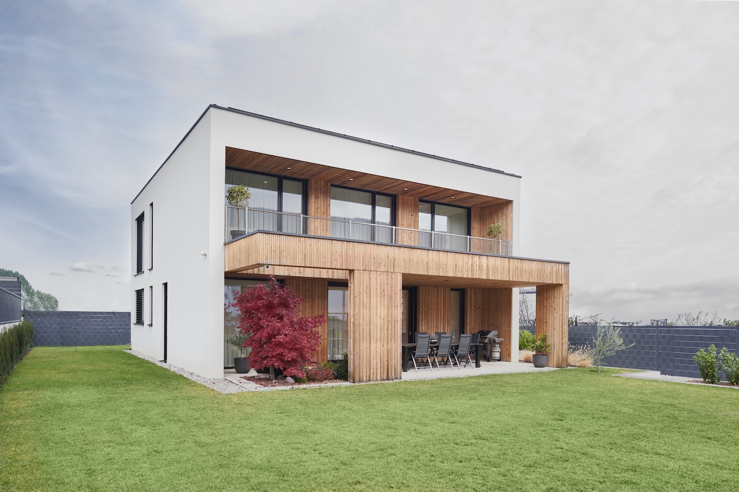 Sodobna lesena hiša z ravno streho združuje minimalistično arhitekturo in naravno toplino lesa. Fasada iz termično obdelanega lesa hiši ne daje le edinstvenega videza, temveč zagotavlja tudi dolgotrajno obstojnost z minimalno zahtevo po vzdrževanju. Velike steklene površine prepuščajo obilico naravne svetlobe v notranjost hiše in obenem odpirajo razgled na okolico.