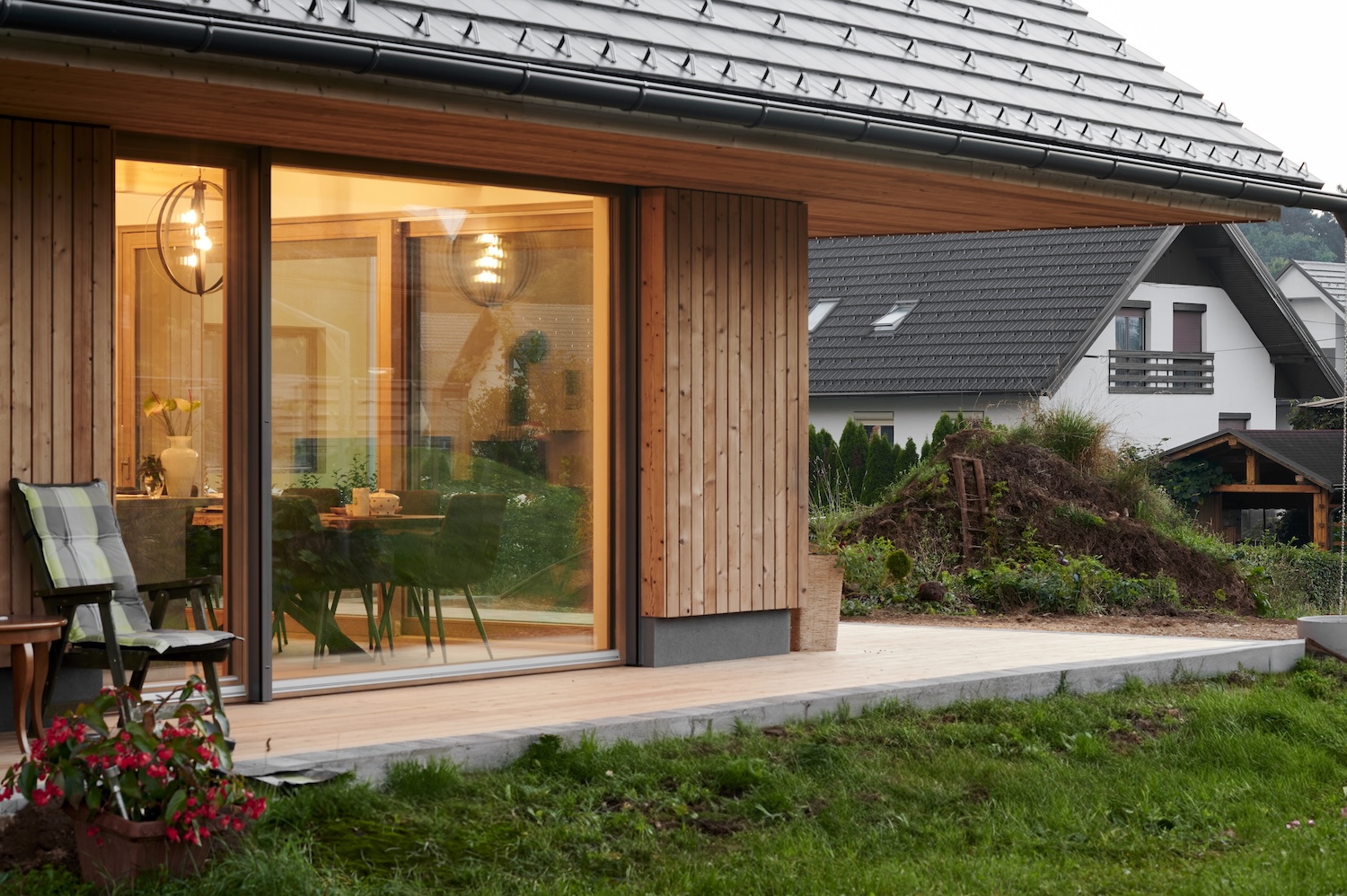 Drsna panoramska vrata brez praga odprejo dnevni prostor neposredno na teraso in zelenico. Poletje postane podaljšek dnevne sobe; zajtrk na prostorni leseni terasi je tako spontana jutranja rutina, ne le redka izjema. Stanovalec pritlične hiše se zjutraj zbudi v neposrednem stiku z naravo, vrtom ali ozelenitvijo. Ne glede na letni čas omogoča stik z zunanjostjo ter občutek umirjenosti in povezanosti s prostorom.